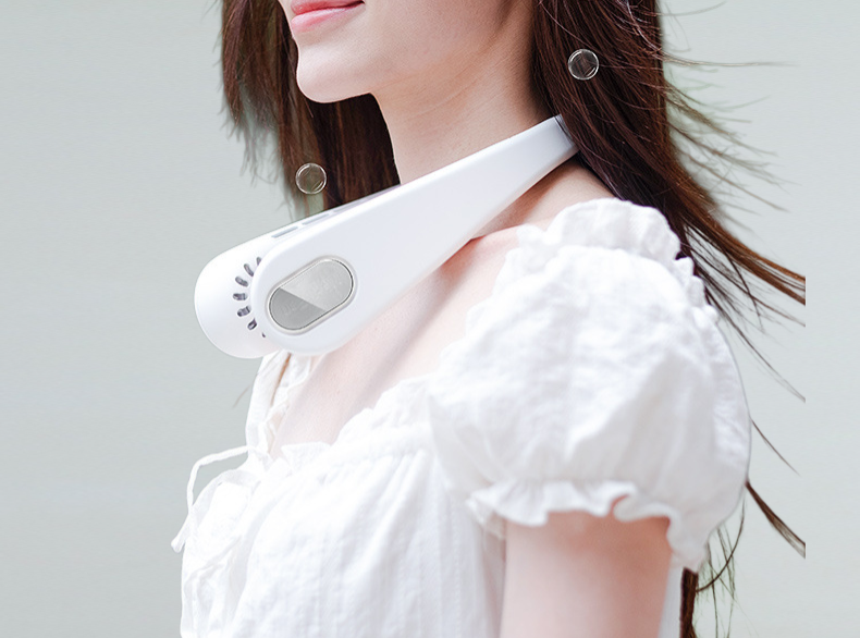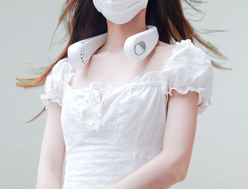 首掛け可能な小型ネックファンの使用イメージ